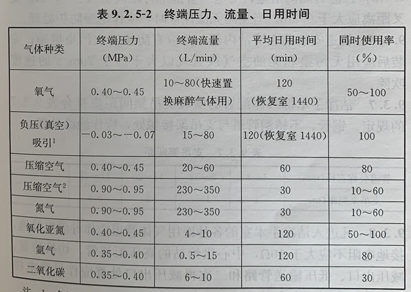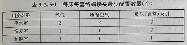 5、每類終端接頭配置數量應按表9.2.5-1確定。手術室醫(yī)用氣體終端壓力流量、日用時間應按表9.2.5-2確定。