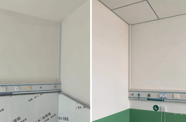 明管加裝飾罩的中心供氧管道安裝方式很好理解,根據(jù)醫(yī)用氣體工程技術(shù)規(guī)范的要求,氣體管道是不允許預(yù)埋到墻里面的,其目的是預(yù)防墻體內(nèi)管道破裂漏氣以及考慮將來(lái)檢修維修方便。上方左圖為某縣級(jí)人民醫(yī)院病房裝修改造醫(yī)用氣體工程,病房?jī)?nèi)棚頂至設(shè)備帶中心供氧管道和中心負(fù)壓吸引管道采用明管裝飾罩的方式。右圖為某正常營(yíng)業(yè)中鄉(xiāng)鎮(zhèn)衛(wèi)生院中心供氧管道,和醫(yī)用中心負(fù)壓吸引管道天花板至設(shè)備帶的氣體管道安裝效果。